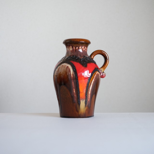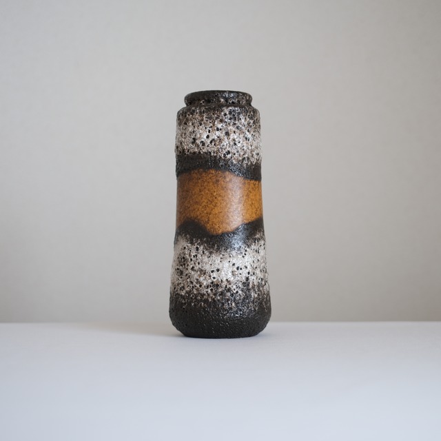 High:18.0cm. Top:5.0cm. Bottom:8.5cm German Art Potteryの中でも形やデザインの個性が強いDümler&Breiden。 こちらはトップのオレンジからボトムにかけて黒い釉薬のグラデーションになっており、中央部に溶岩釉をアクセントにした非常にバランスの良いデコレーション。これぞ、Fat Lavaというお手本の様なデザイン。 目立った傷やヒビなどは見受けられずコンディションの良い一点です。 ※ヴィンテージ品のため、汚れや小さな擦り傷などがある場合があります。また、画像と実物で多少、色の誤差がある事もご了承頂けたら幸いです。 ※陶器の特徴として、経年劣化により瓶底から水が滲み出る場合がございます。その為、生花を生ける際は敷物をする等、水漏れがないかご確認の上、 ご使用頂きますようお願い致します。 上記内容を御理解頂きました上でのご購入をお願いします。