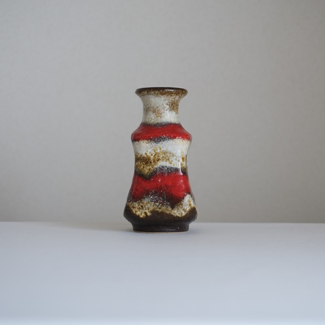 サイズ;High:21.0cm. Top:8.0cm. Bottom:8.0cm German Art Potteryの中でも形やデザインの個性が強いDümler&Breiden。 中央にくびれのある特徴的なフォルムに赤×白の溶岩釉のコントラストが美しいデコレーション(デザイン)。他にも緑やオレンジがあり、型も幾つか存在するdümler & breidenを代表するデザインの一つ。 目立った傷やヒビなどは見受けられずコンディションの良い一点です。 ※ヴィンテージ品のため、汚れや小さな擦り傷などがある場合があります。また、画像と実物で多少、色の誤差がある事もご了承頂けたら幸いです。 ※陶器の特徴として、経年劣化により瓶底から水が滲み出る場合がございます。その為、生花を生ける際は敷物をする等、水漏れがないかご確認の上、ご使用頂きますようお願い致します。 上記内容を御理解頂きました上でのご購入をお願いします。