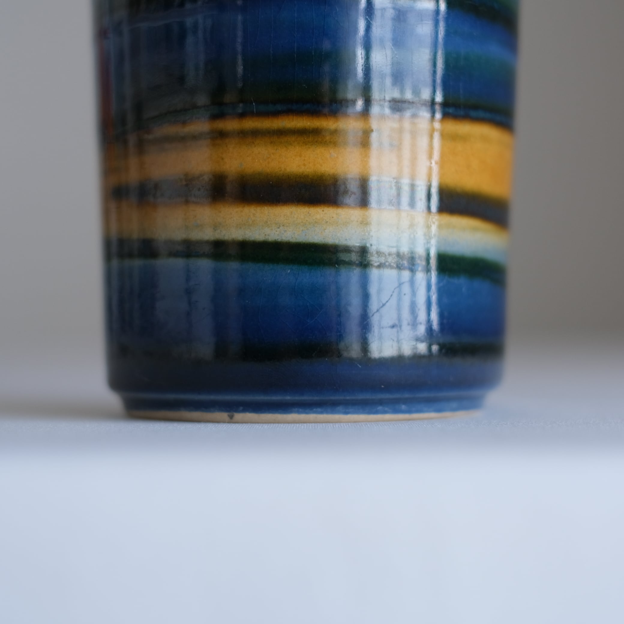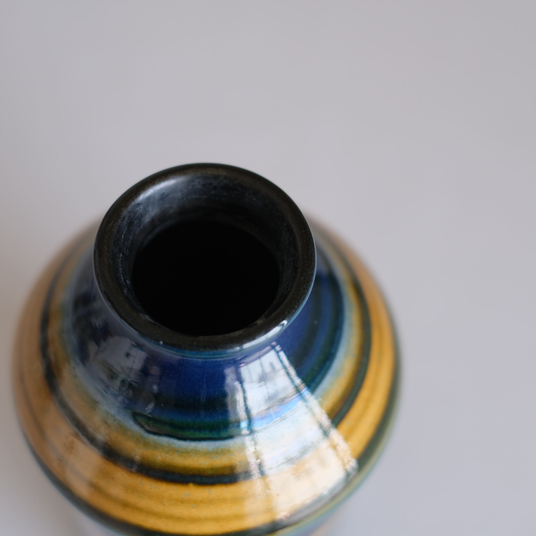 鉛筆のようなフォルムにgerman art potteryでは珍しい青と黄色の釉薬を使用した非常にセンスの良い個体。花瓶口か小さく、お花もいけ易いのもポイント。