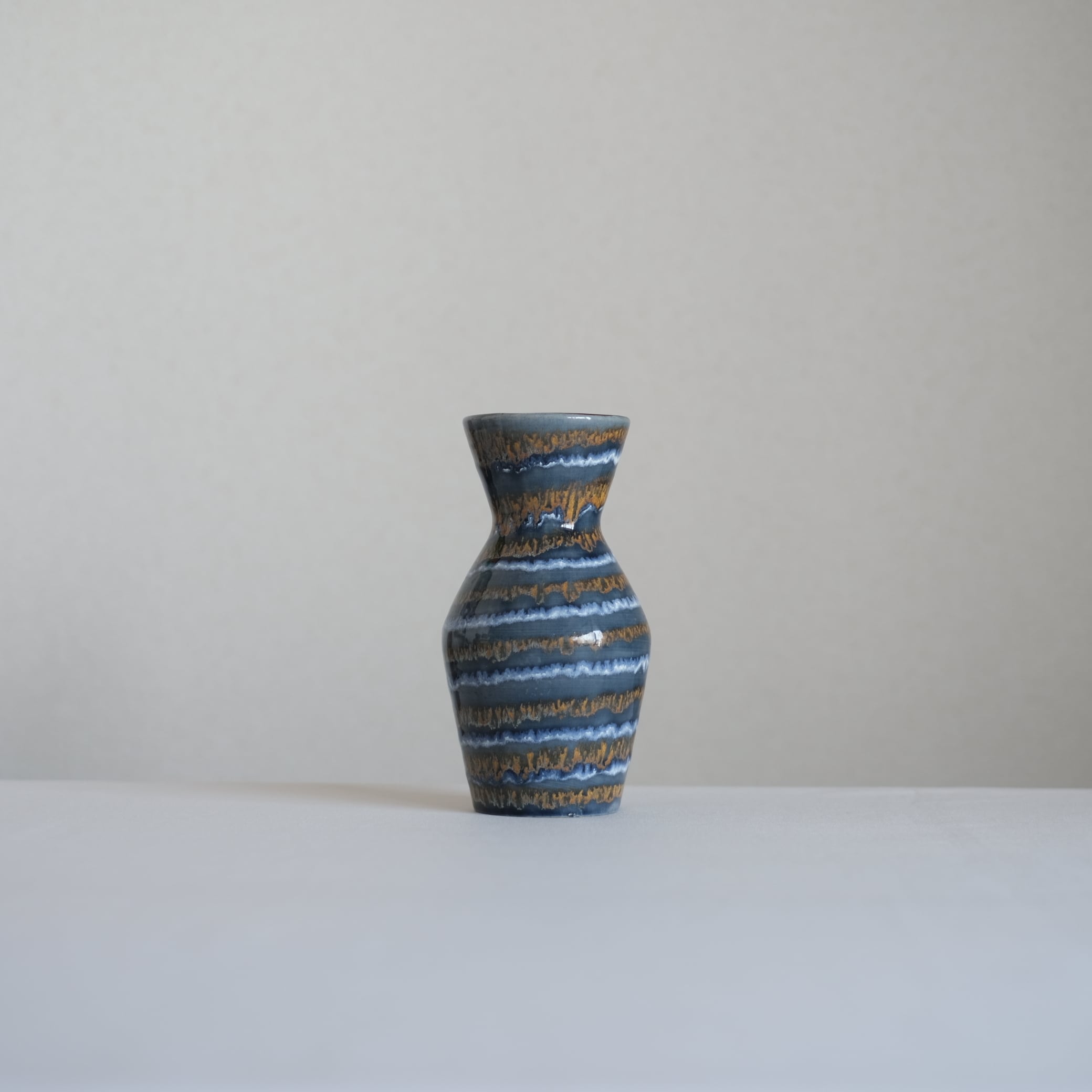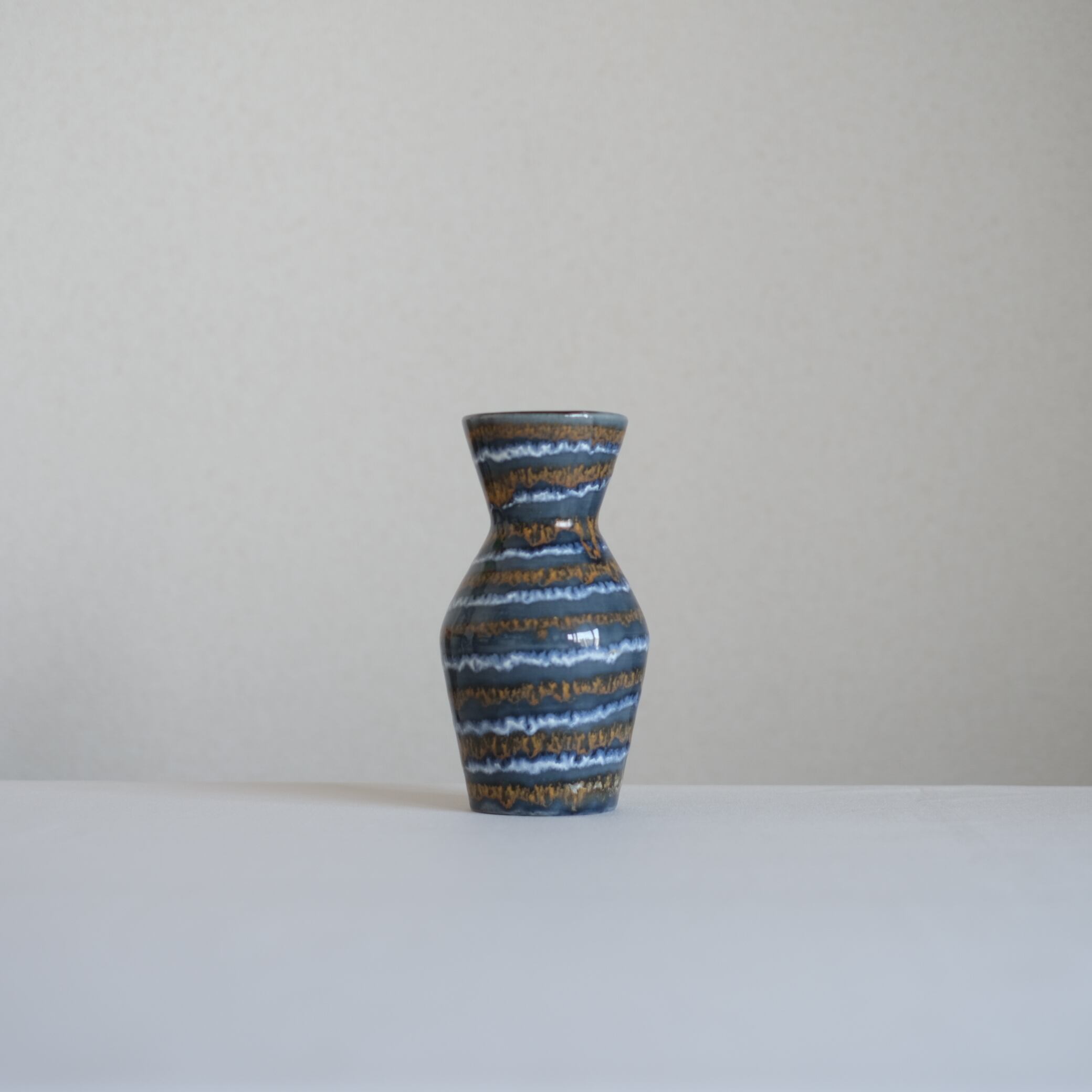 グレーがかった、くすんだブルーに白とベージュのハンドペイントで描かれたボーダーのデコレーションも良い雰囲気の個体。