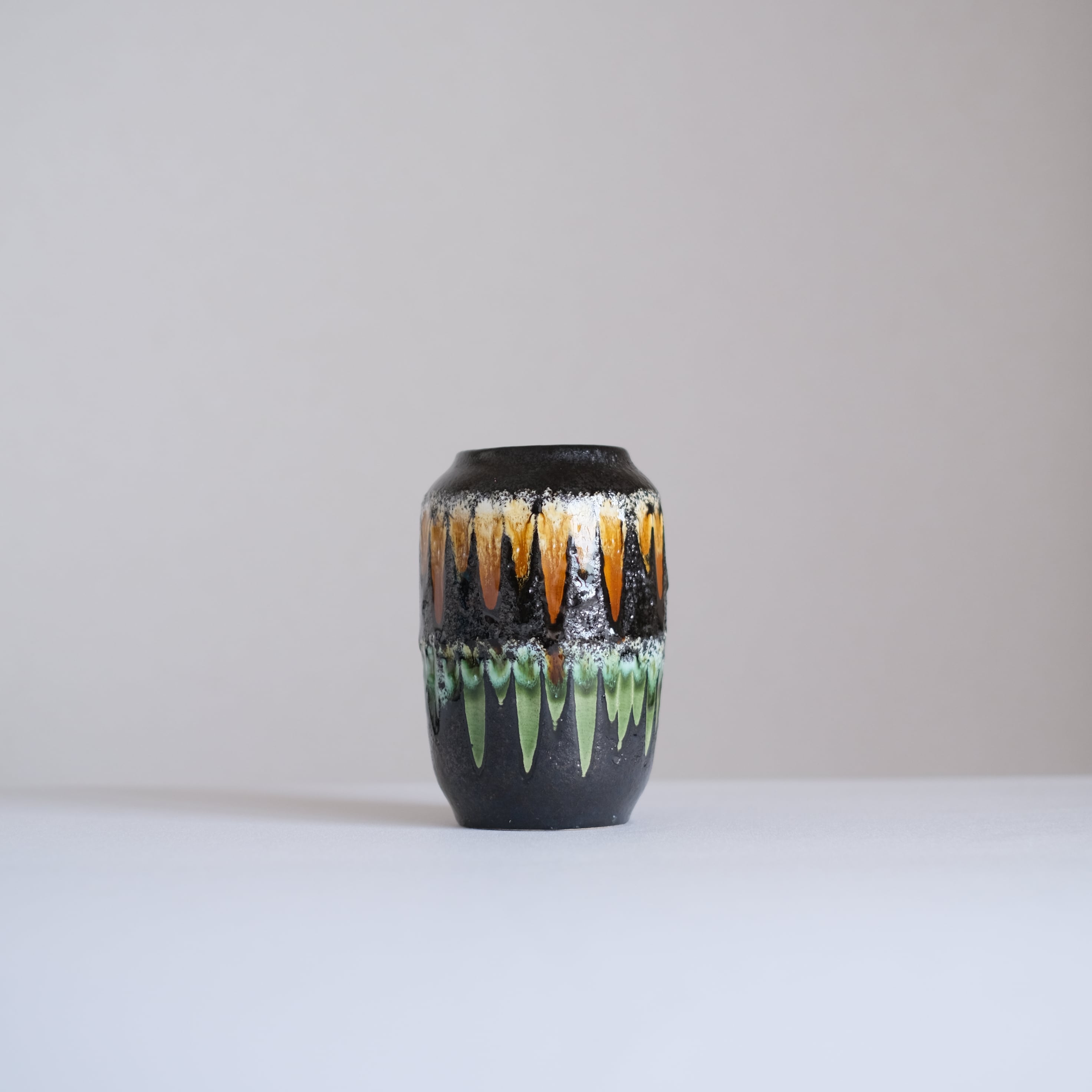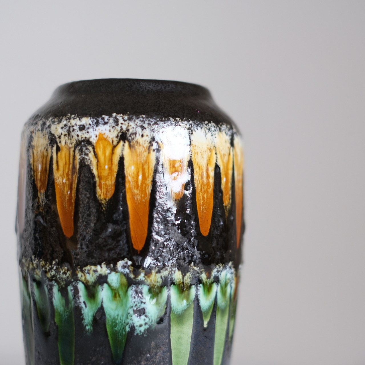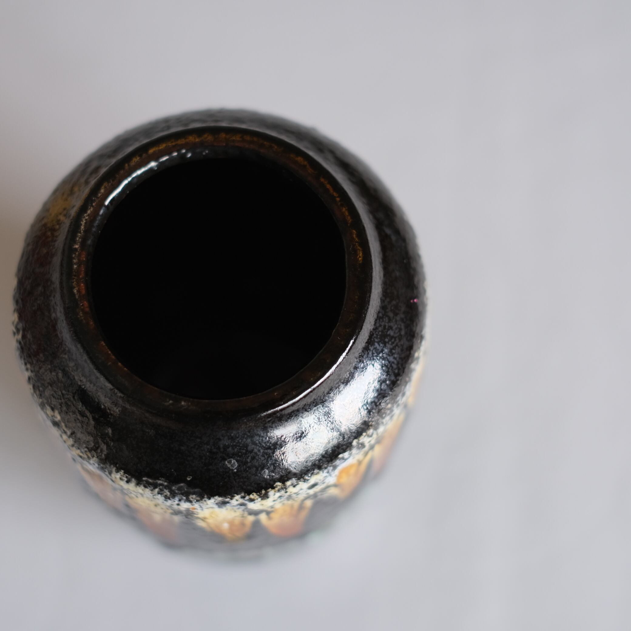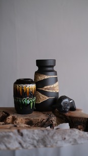 こちらのscheurichは花瓶底のホールマークが縦に刻印されたscheurichで、1963年に作られた古い個体。german art potteryでは珍しい黒ベースのデコレーションでプリミティブ感が強く、写真7のような暗めの花器やオブジェで統一感を出すとモダンな印象になりオススメです。