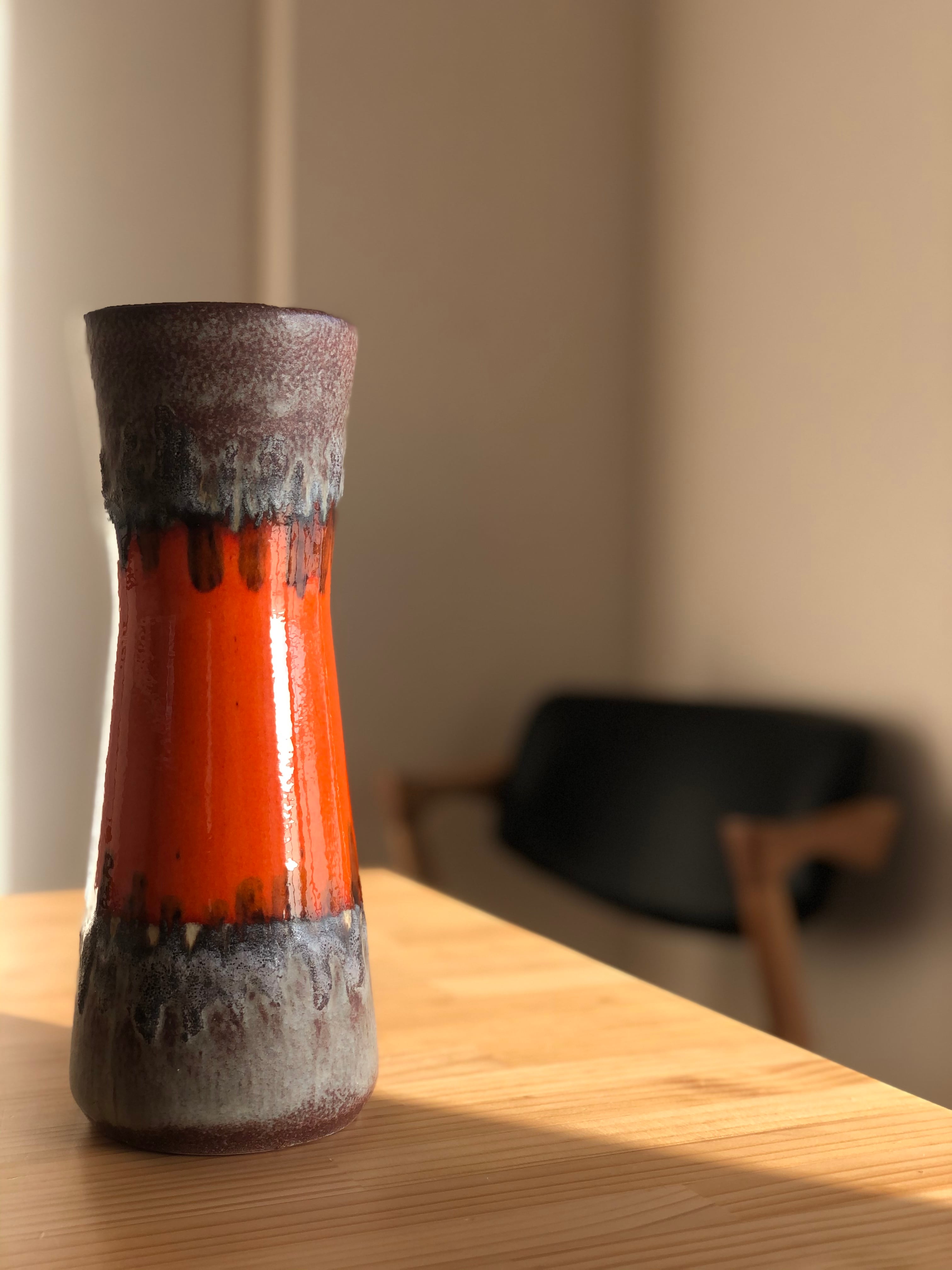 こちらは、ファットラヴァらしい釉薬使いでオレンジが目を引く綺麗な作品です。くびれのあるデザインもスタイリッシュでモダンな印象かと思います。