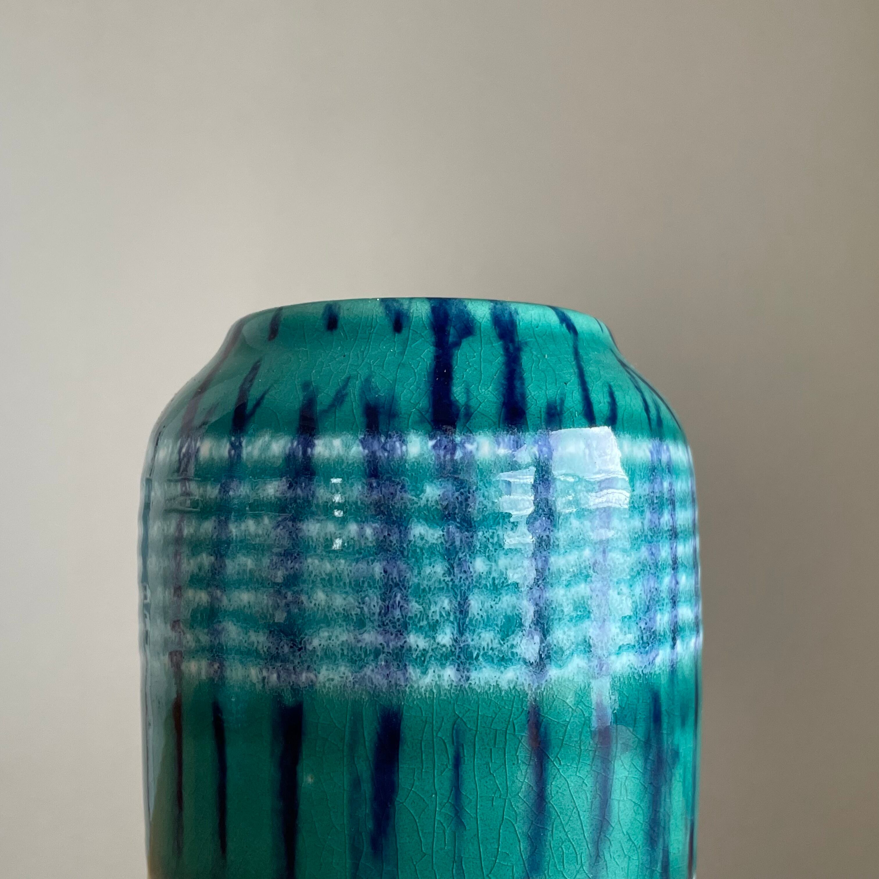 こちらのscheurichはどのコレクターに聞いても中々見つからない、かなり珍しいscheurichです。ターコイズカラーにハンドペイントの薄いホワイトのボーダーとネイビーのストライプが重なり、綺麗なチェック柄になったデザインで flat. ではオープン当初からコレクションしてきた思い入れのある作品です。是非、実物をご覧頂きたいです!