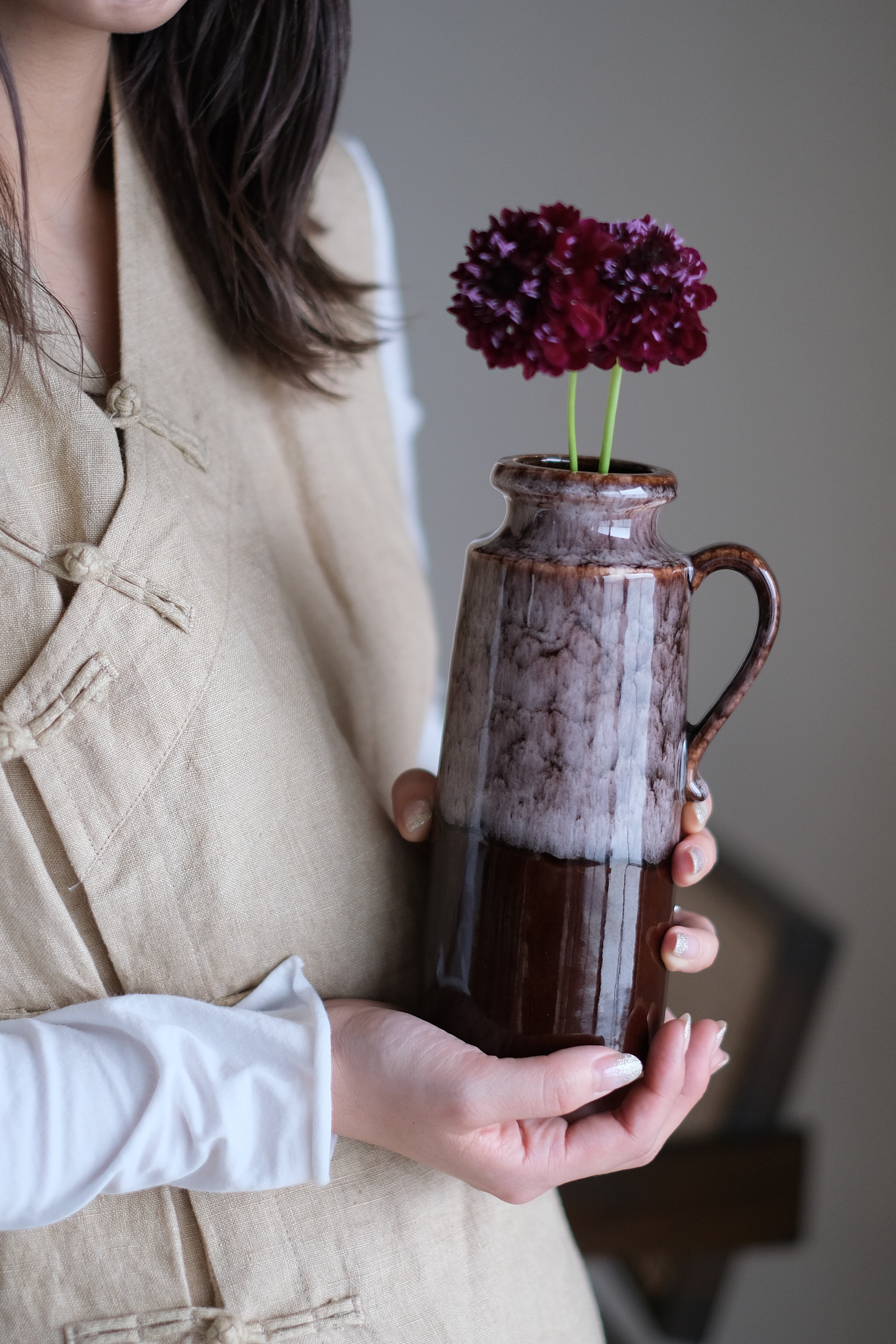 ブラウンベースに白い釉薬を重ねる事で大理石のような柄になっており非常にセンスを感じる作品です。今回、同色で3型ご用意しておりますので型違いで並べてレイアウトするのも大変オススメです!