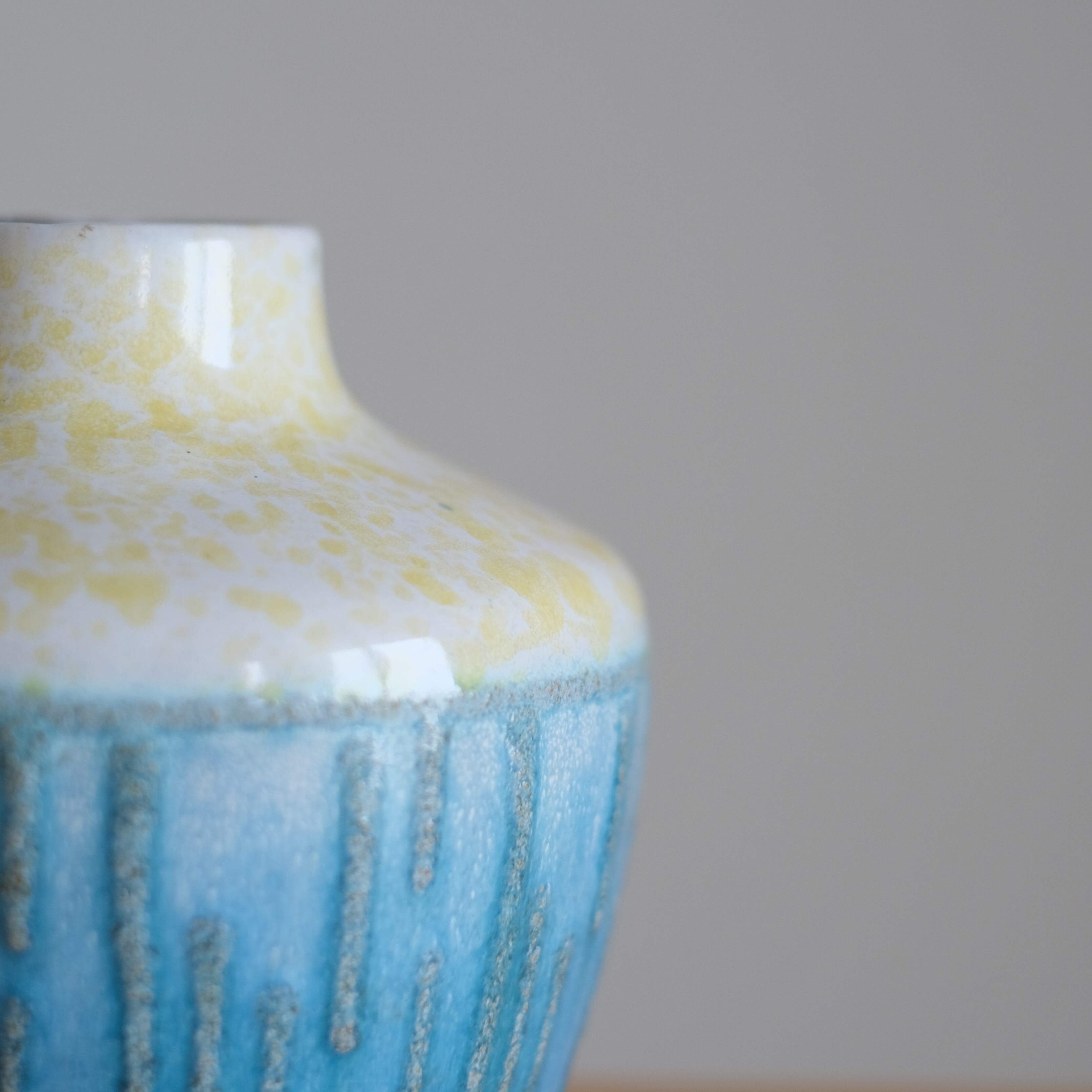 こちらの花器は、ホワイトベースにイエローのスプラッシュ、センターには立体感のある釉薬にブルーを乗せた非常にセンスを感じる作品でこれからの時期は紫陽花等をいけても雰囲気が良くオススメです!