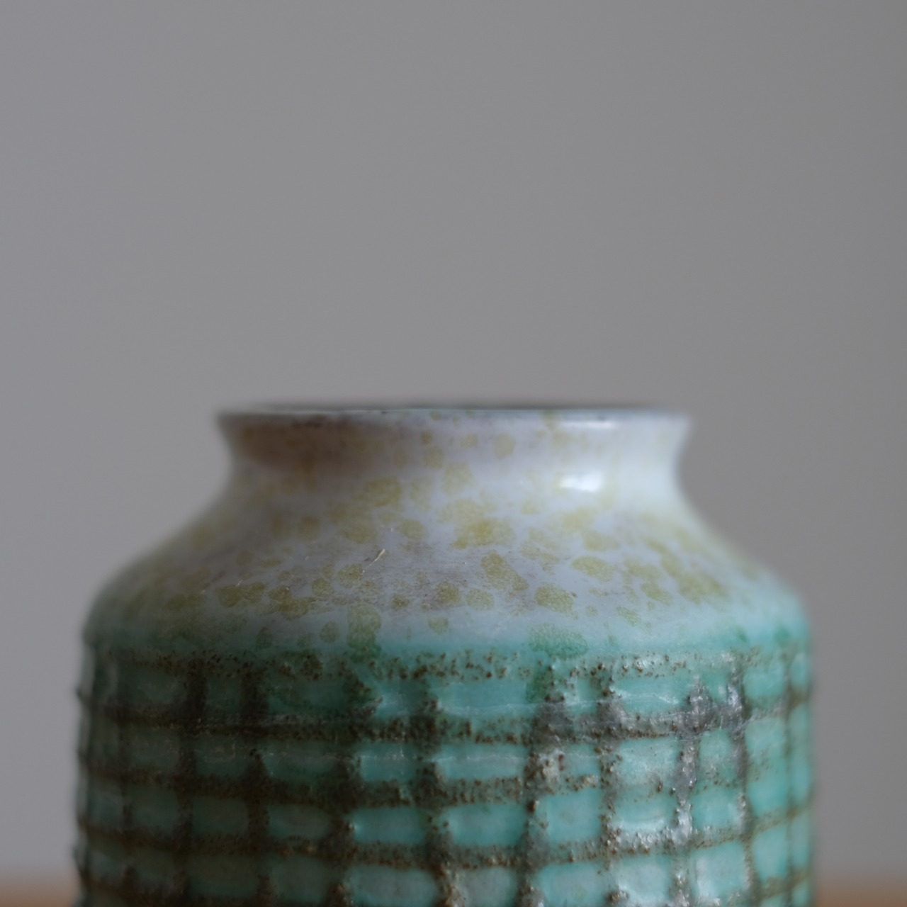 こちらの花器は、ホワイトベースにイエローのスプラッシュ、センターには立体感のある釉薬にグリーンをのせた非常にセンスを感じる作品です。かなり小ぶりな作品なので、同デザインの型違いを並べてレイアウトするのもオススメです!