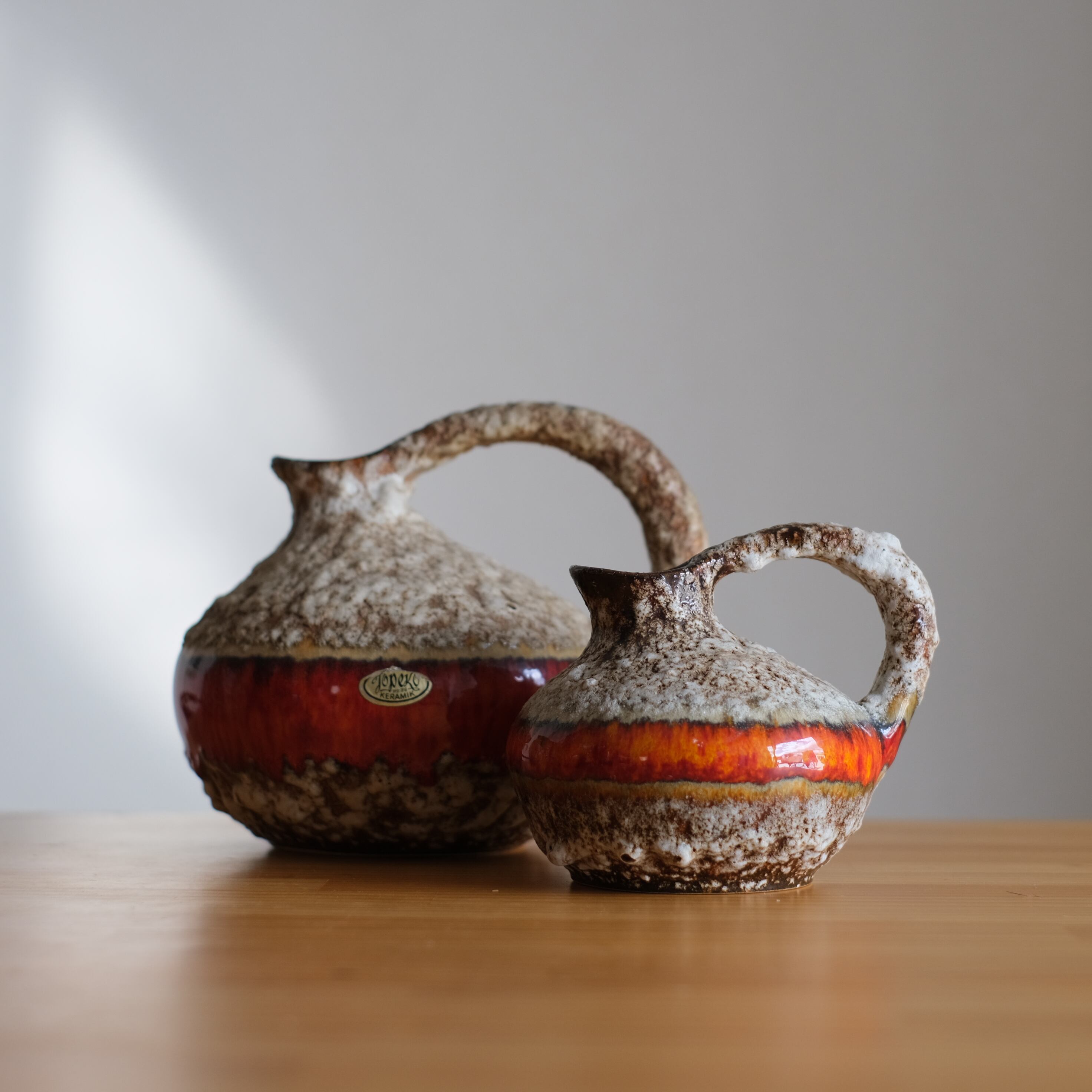 赤やグリーンの鮮やかな釉薬とFat Lava釉薬のコントラストが非常に綺麗な作品。ミッドセンチュリー家具との相性も抜群で海外のコレクターにも非常に人気の高いjopeko。