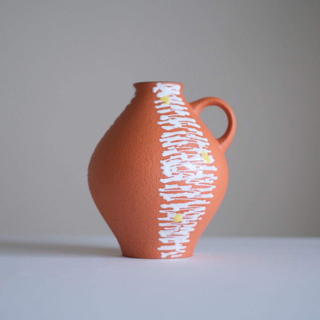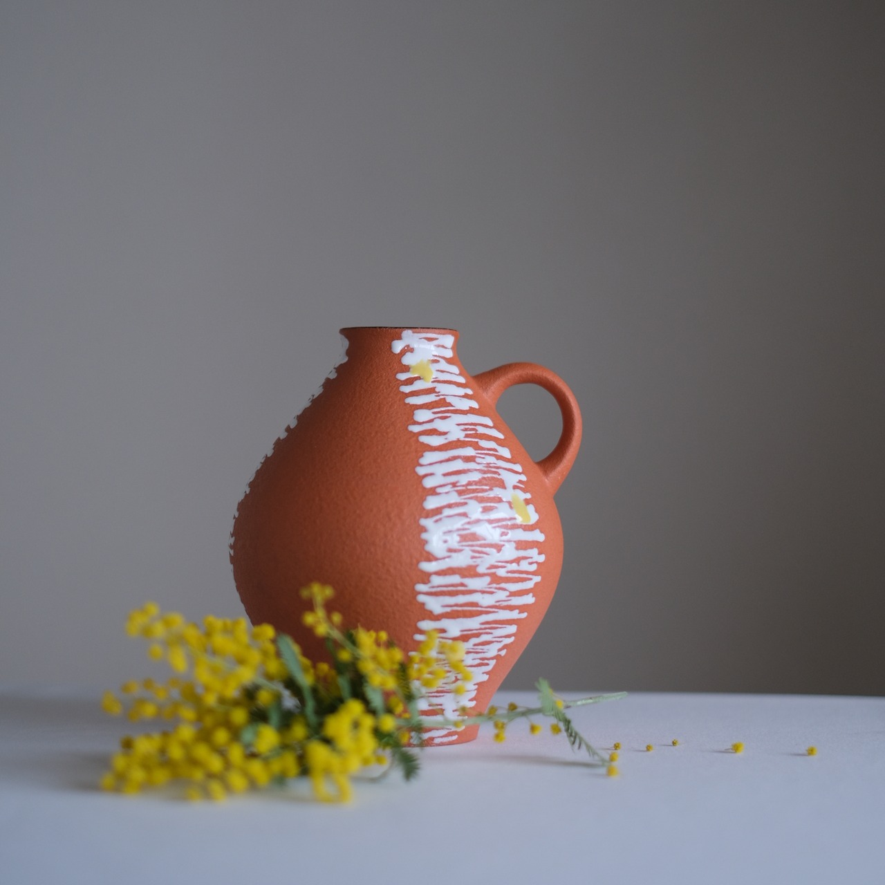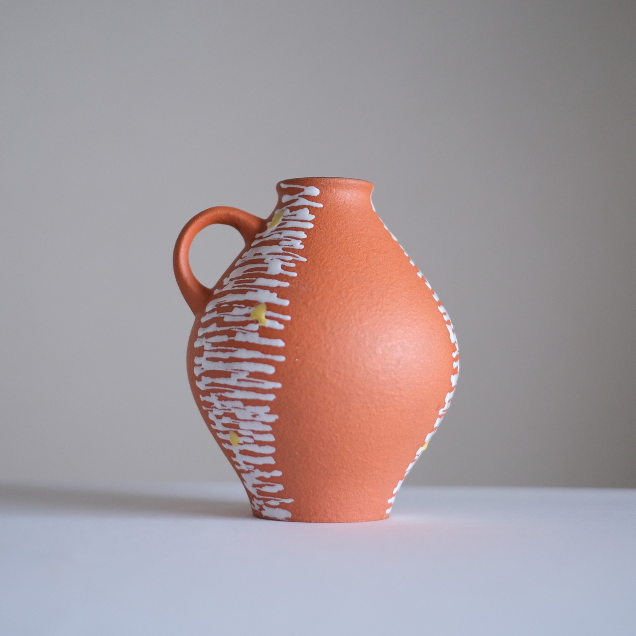 こちらはレンガのようなテラコッタに、まるで湖に反射する月のあかりのような模様が入ったデザインで所々に黄色い釉薬が散りばめられた非常に趣きのある花器です。