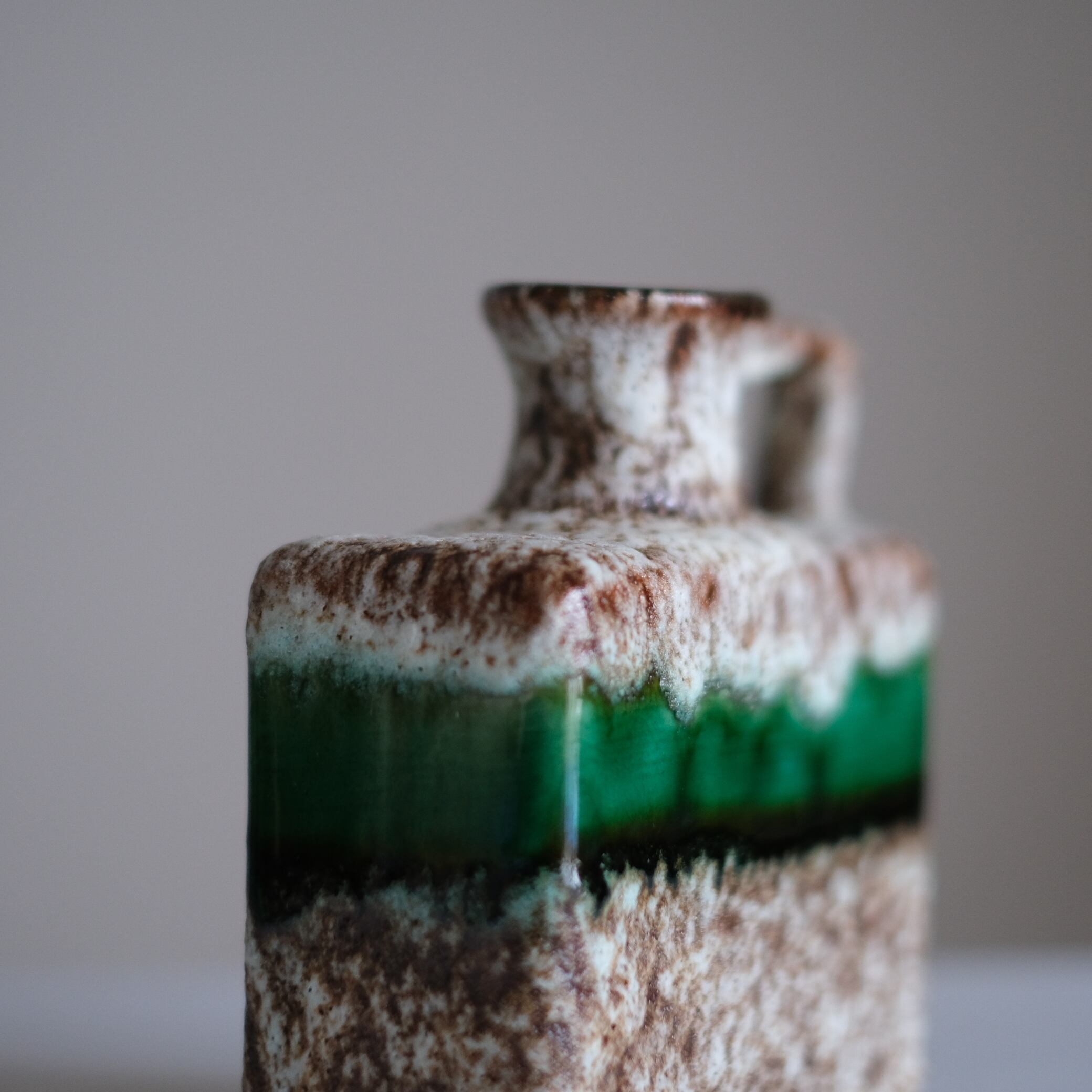 レッドやグリーンの鮮やかなベースカラーに白い溶岩釉のコントラストが非常に綺麗で海外のコレクターにも人気の高いjopeko。その中でもこちらは他の型に比べて、個体数の少ないスクエア型のjopekoの花器。ハンドルも丸型ではなく角度が付いたデザインで非常にセンスを感じるフォルムです。