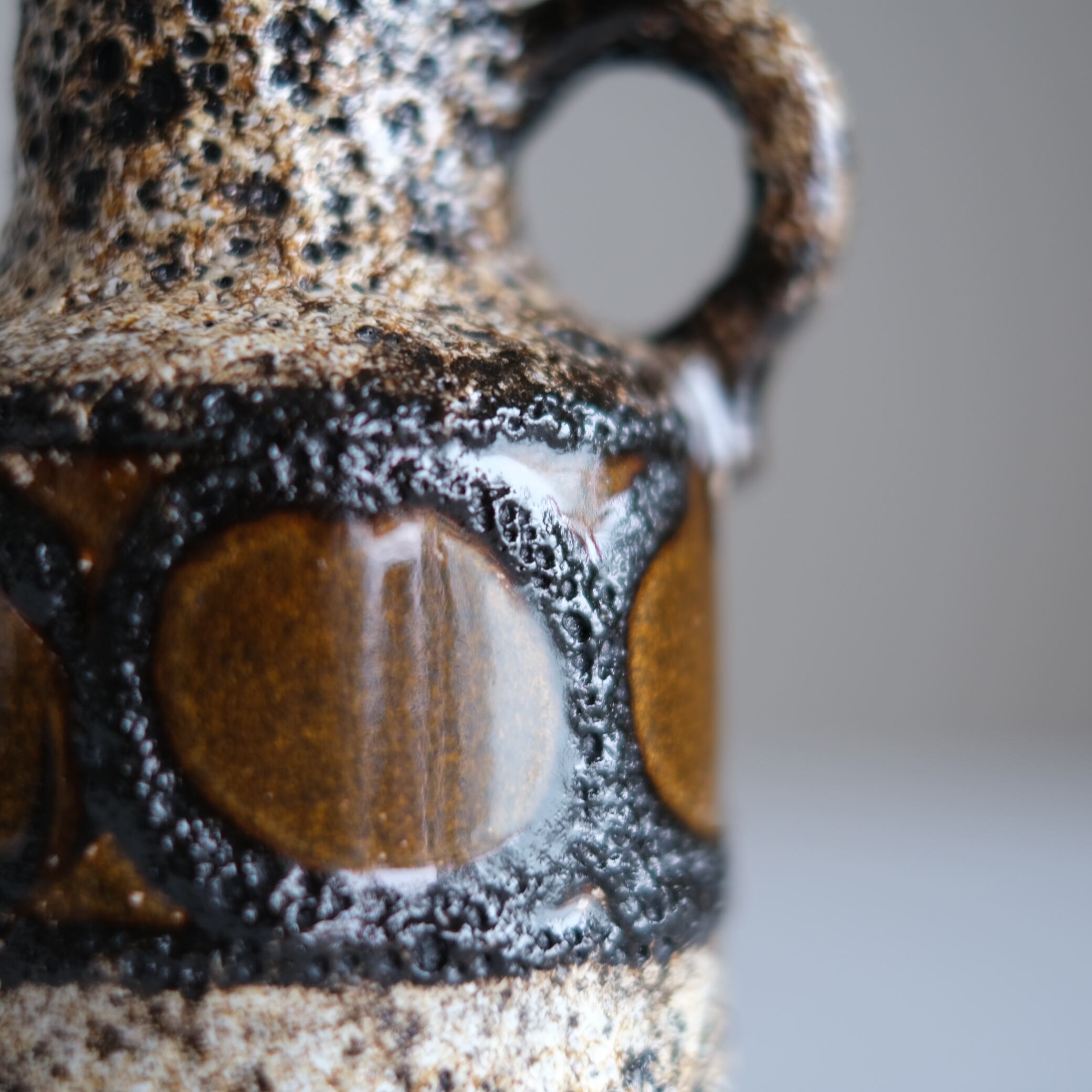 こちらは414-16という型でカラーバリエーションが豊富で、この型の色違いを沢山所有するコレクターも存在します。こちらはファブリックメーカーminä perhonenの代表的な柄〝 tambourine 〟に似たデザイン。サークルが横1列に並んだデザインで、配色、溶岩釉のバランスどれをとっても素晴らしいデザインです。