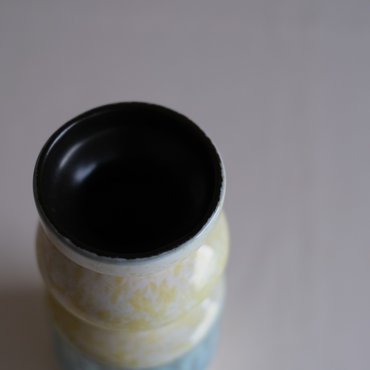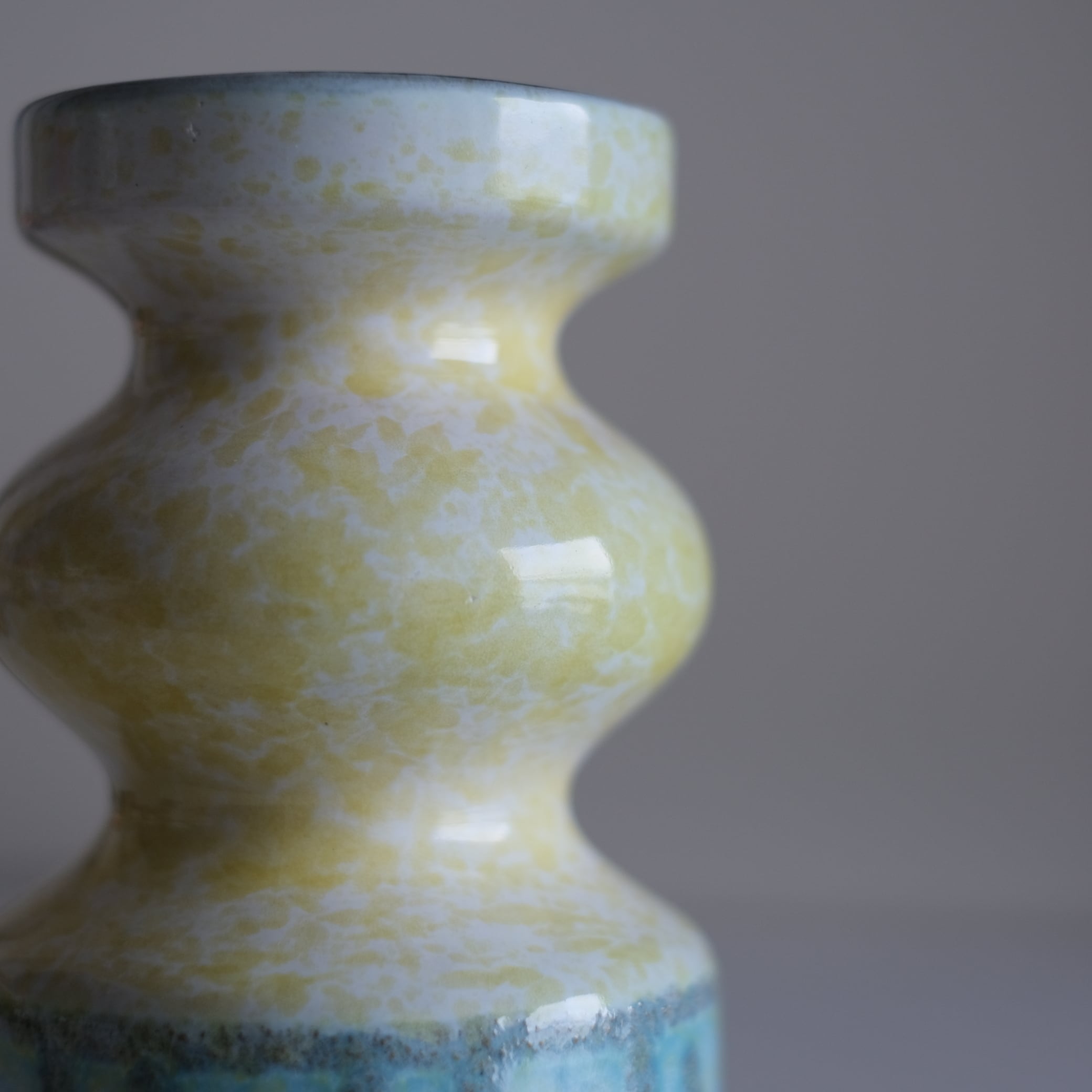 国営のHaldenslebenは東ドイツのメーカーで品質の良さでも定評のあるメーカーです。西ドイツに比べると東ドイツのメーカーは保守的で温かみのある素朴なデザインの花器が多く、北欧テイストのインテリアや日本家屋との相性は抜群なのでFat Lavaの毒々しい雰囲気が少し苦手。という方へも大変お勧めです。こちら白地に淡い黄色のマーブルと水色の釉薬がアクセントカラーになった夏らしい爽やかなデザイン。空間を柔らげる面白いフォルムなのでお部屋の良いアクセントになりオススメです。ポストモダンなどのインテリアとも相性が良さそうです。